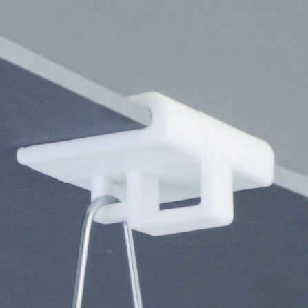 Пластиковая петля-клипса, защелкивающаяся с боковой стороны направляющей стандартного подвесного потолка.