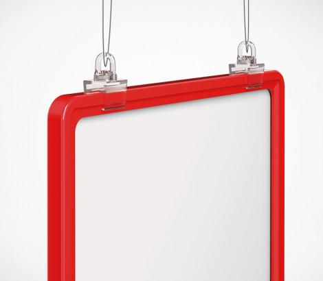 Клипса для подвешивания пластиковых рам на трос, цепочку и т.д. Имеет поворачивающуюся петлю, что позволяет позиционировать рамки и исключает "закручивание" подвесного троса. Закрепляется с верхней стороны рамки.