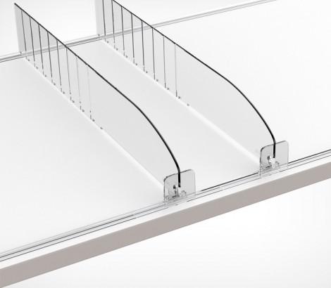 Разделитель DIV60-BT30 выс.60 мм с передним огран.30 мм 185-385мм — пластиковый разделитель с передним ограничителем. Имеет насечки с шагом 25 мм для обламывания по длине, материал: прозрачный ударопрочный пластик. Применение: для организации выкладки небольших лёгких товаров, таких как сигареты, лекарства, парфюмерия и косметика.