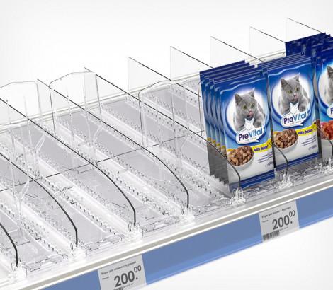 Пластиковая задняя опора используется индивидуально или в комплекте с ребристым профилем BACKLINE. Ребристые выступы в нижней части опоры удерживают плоские упаковки товара, обеспечивая его идеальную подачу покупателю.