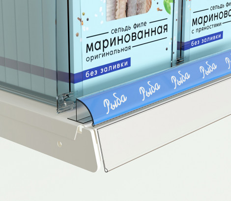 Используется как держатель для эффективного размещения рекламных вставок в зоне выкладки брендовых товаров или ценников, а также служит передним ограничителем для товара, предотвращая его падение с полки.