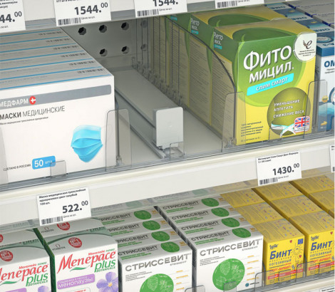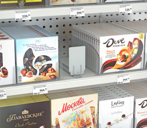 Толкатель FORTA NORMA-1 — используется в магазинах и супермаркетах для презентации товаров в небольшой упаковке, например, сигаретных пачек или лекарств, изготовлен из прочного пластика, фиксирует последнюю упаковку у края полки. Рекомендуется использовать с разделителями, имеющими передний ограничитель